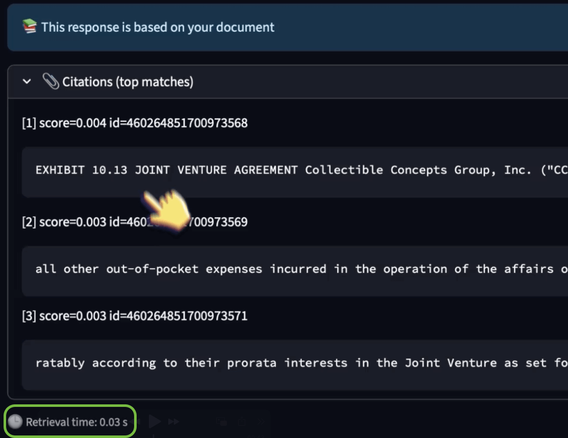 Below, we asked: “Which firm partnered with Collectible Concepts Group, and what were the terms?” and generated the correct response while querying 50M+ vectors in just 0.03 seconds: