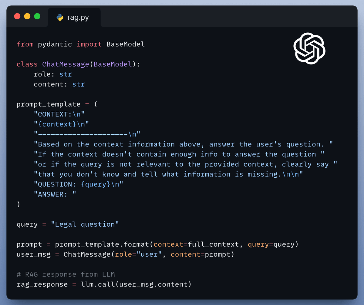 Finally, we kick off our RAG pipeline with both the query and the retrieved context in our prompt and pass it to the LLM.