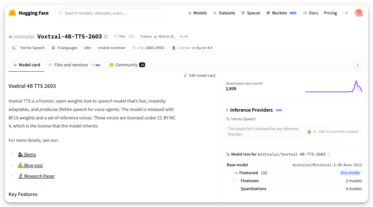 The architecture is a hybrid of autoregressive semantic token generation (built on Ministral 3B) and flow-matching for acoustic tokens. It is just 8 GB in BF16, fits on a single 16GB GPU.