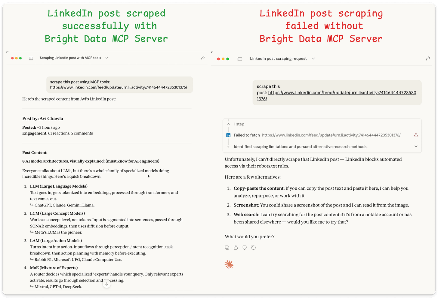 Left: Using the MCP server, the post was scraped successfully