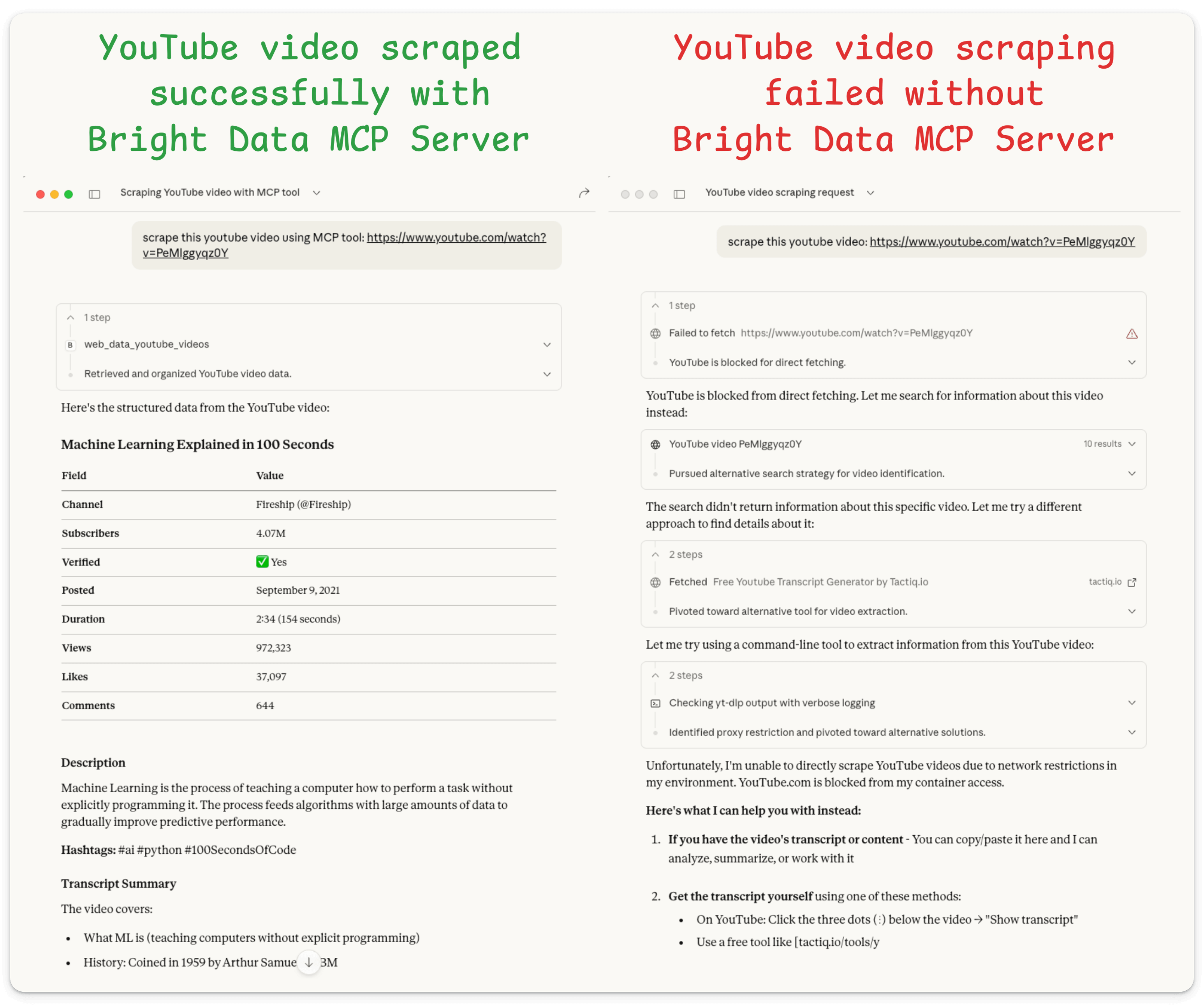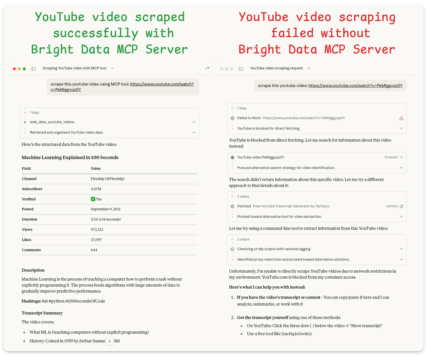 Yet again, we test this on a protected website (YouTube) and the MCP server successfully scrapes the data, which Claude alone failed to do:
