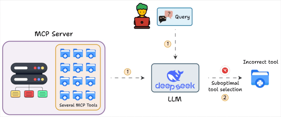 Reduced accuracy: The LLM gets distracted by irrelevant tools and may hallucinate parameters