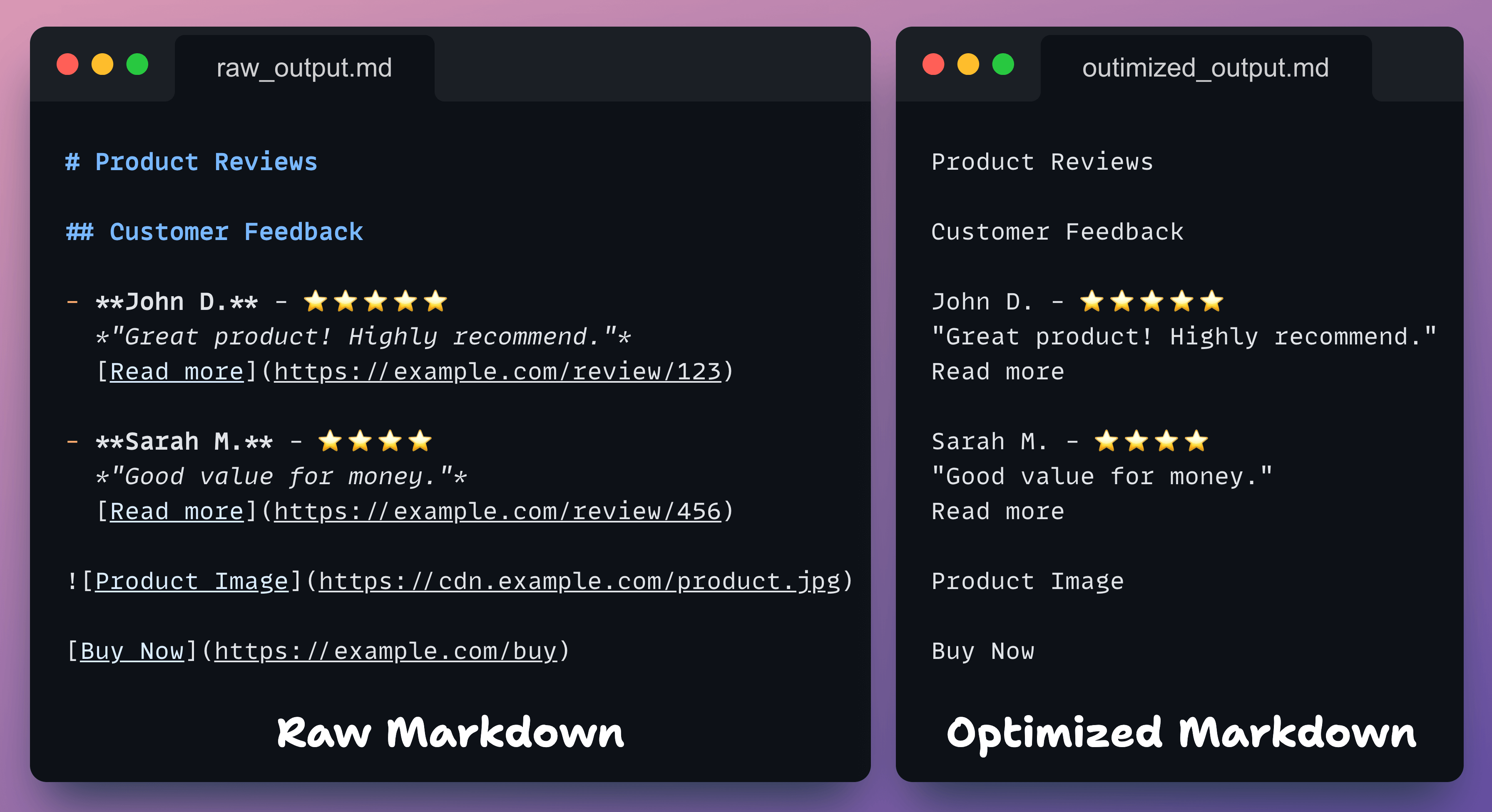 A sample markdown before and after processing is shown below: