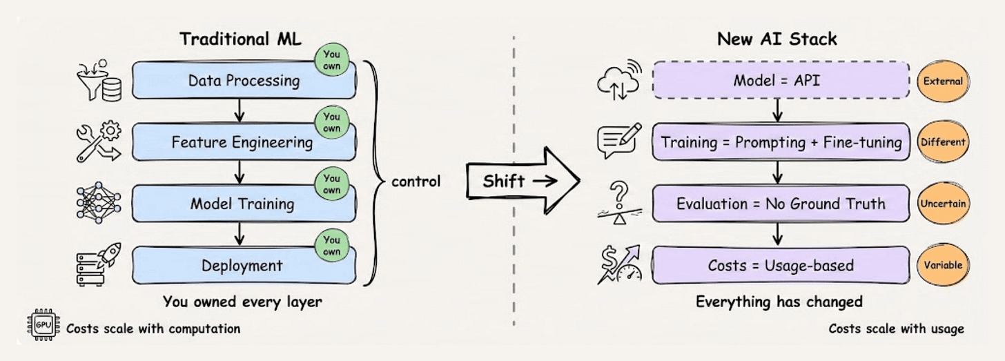 The new stack is different. The model is an API. The training is prompting and fine-tuning. The evaluation has no ground truth. The costs scale with usage, not computation.