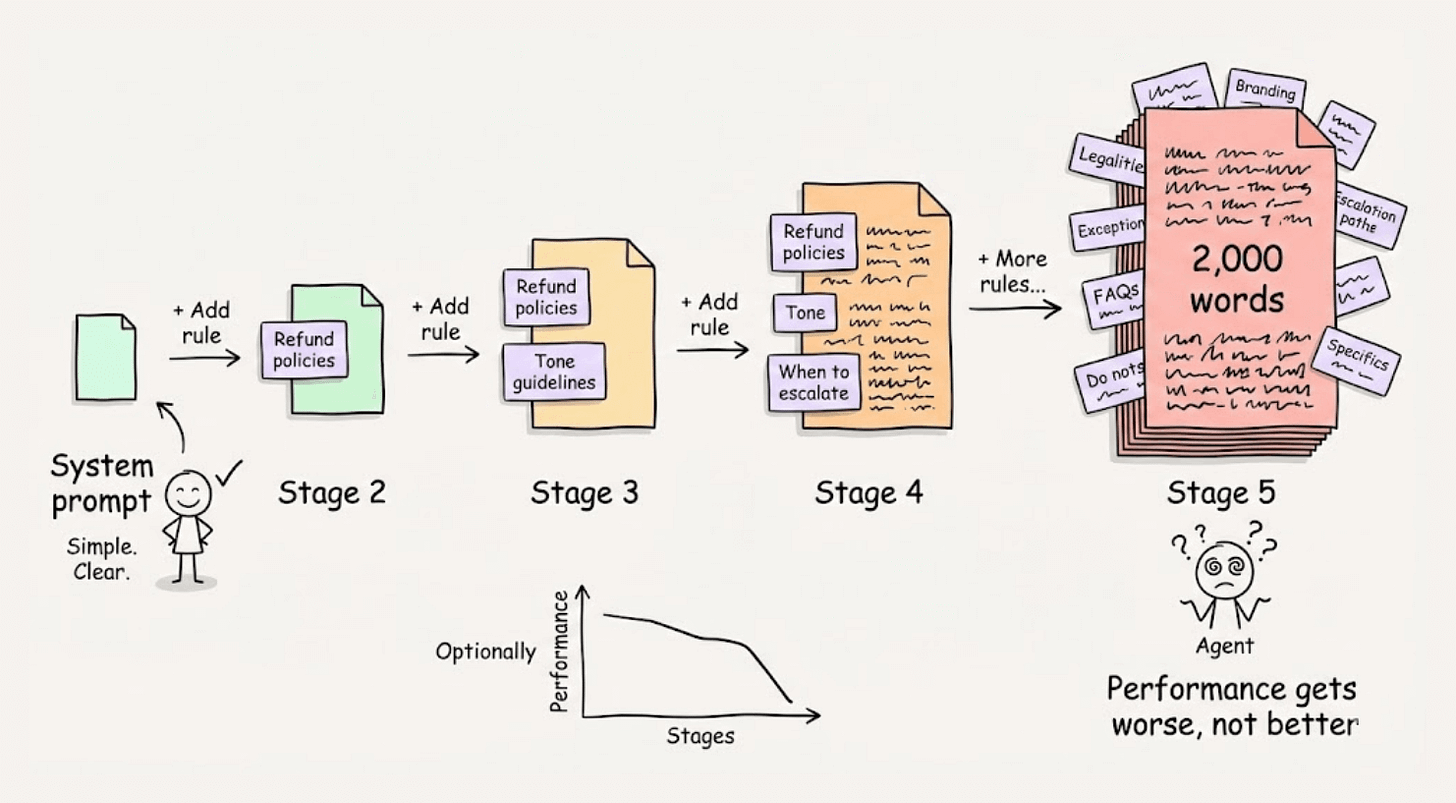 For example, you add a rule about refund policies. Then one about tone. Then another about when to escalate. Before long, you have a 2,000-word instruction manual.