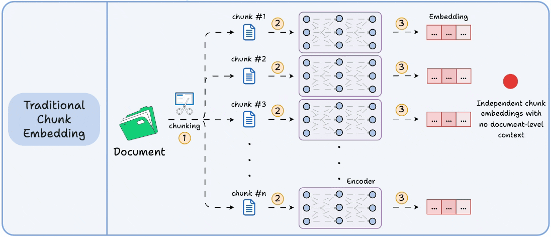 Technically, unlike traditional chunk embedding, the model processes the entire doc in a single pass to embed each chunk.