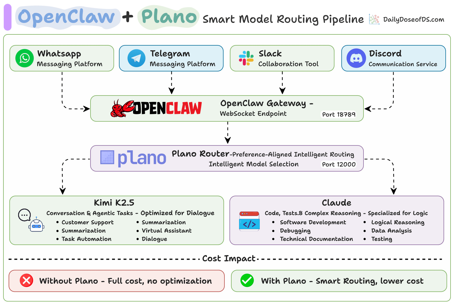 This registers Plano as OpenClaw’s LLM backend. All requests are routed through Plano on port 12000, which directs them to Kimi K2.5 or Claude based on the prompt content.