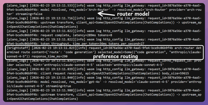 Here’s a trace showing how Plano handled a routing decision. When we wanted to generate code, it used Claude instead of Kimi.