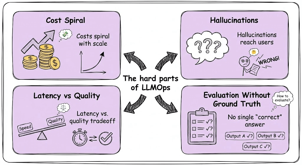 But the hard part is everything around it, like managing costs that spiral with scale, handling hallucinations before they reach users, optimizing latency without sacrificing quality, and building evaluation systems for outputs that have no single “correct” answer.