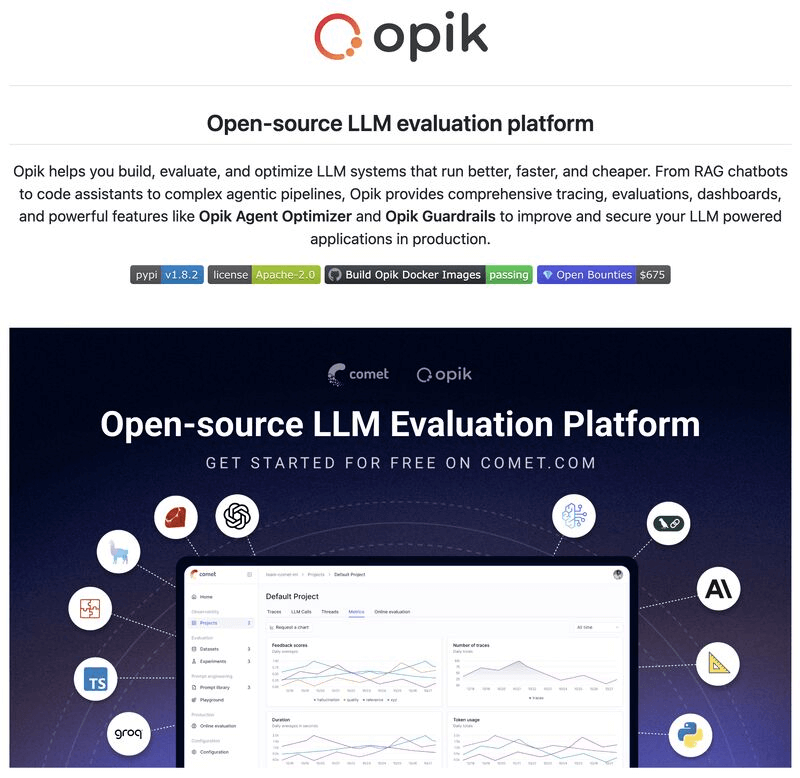 Opik is a 100% open-source production monitoring platform for LLM apps that gives real-time insights, feedback tracking, and trace analytics at daily/hourly granularity for enterprise-scale apps.