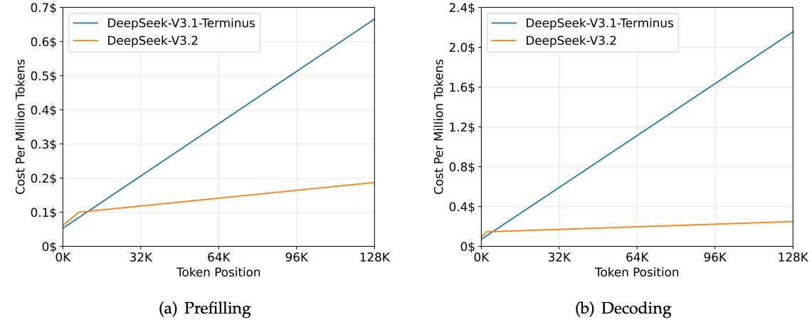 At 128K context, prefilling costs drop from ~$0.65 to ~$0.35 per million tokens. Decoding drops from ~$2.4 to ~$0.8.