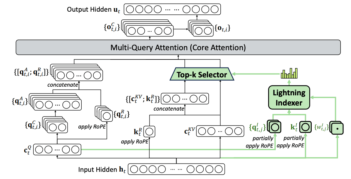A lightweight Lightning Indexer scores which tokens actually matter for each query. Small number of heads, runs in FP8, computationally cheap. Then a selection mechanism retrieves only the top-k key-value entries.
