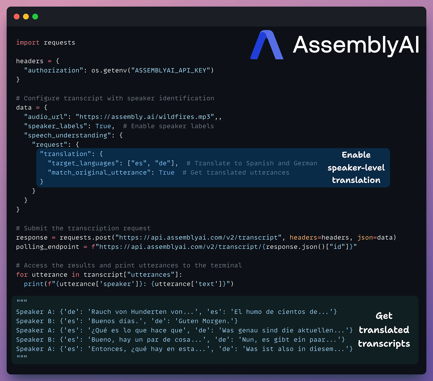 Receive a translated transcript in 89 supported languages