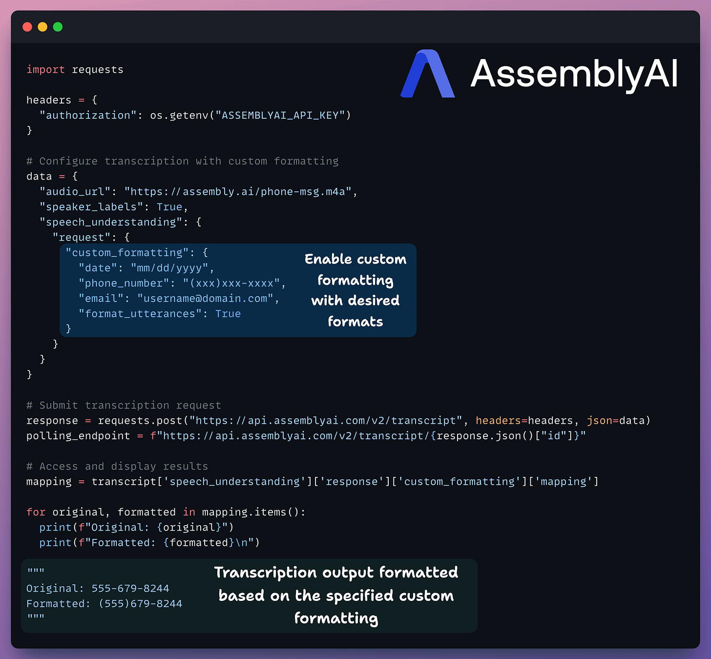 Receiving well-formatted transcripts is important if some downstream automation deals with dates, emails, phone numbers, or financial records.
