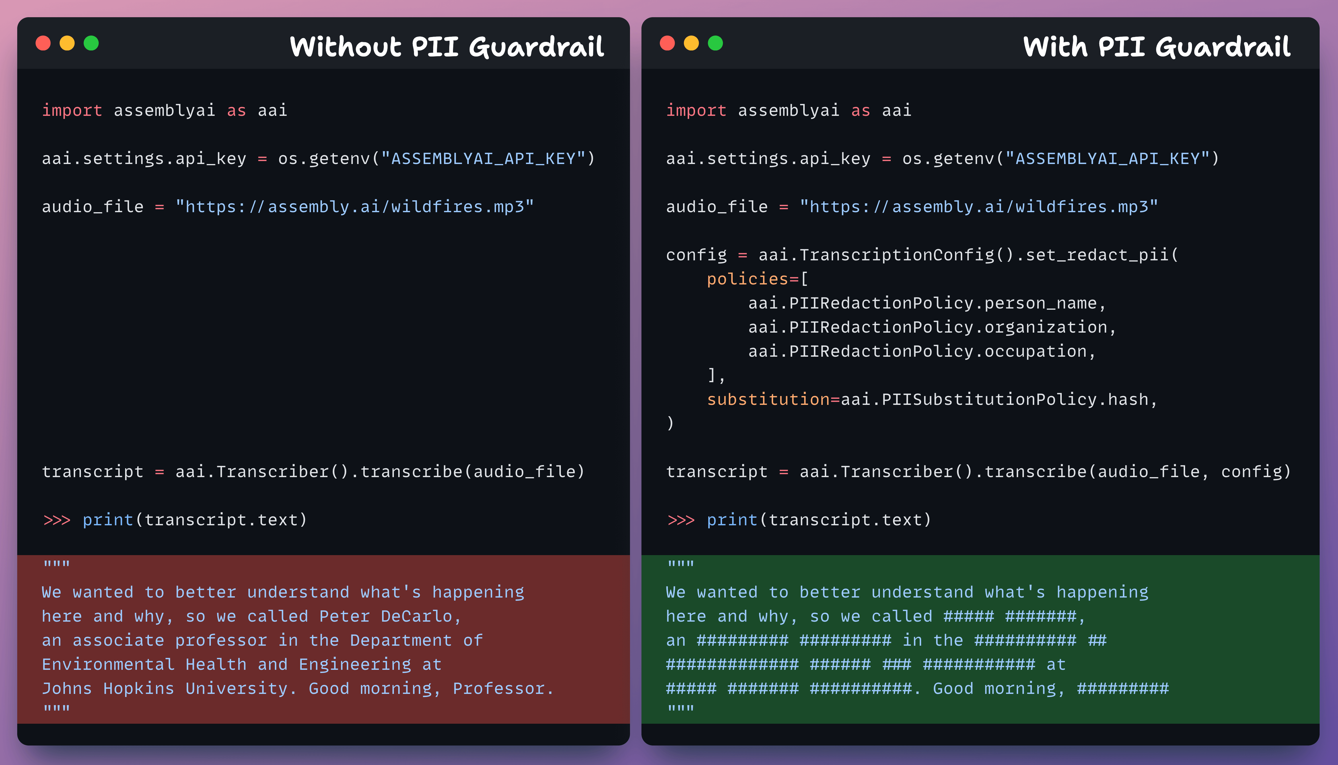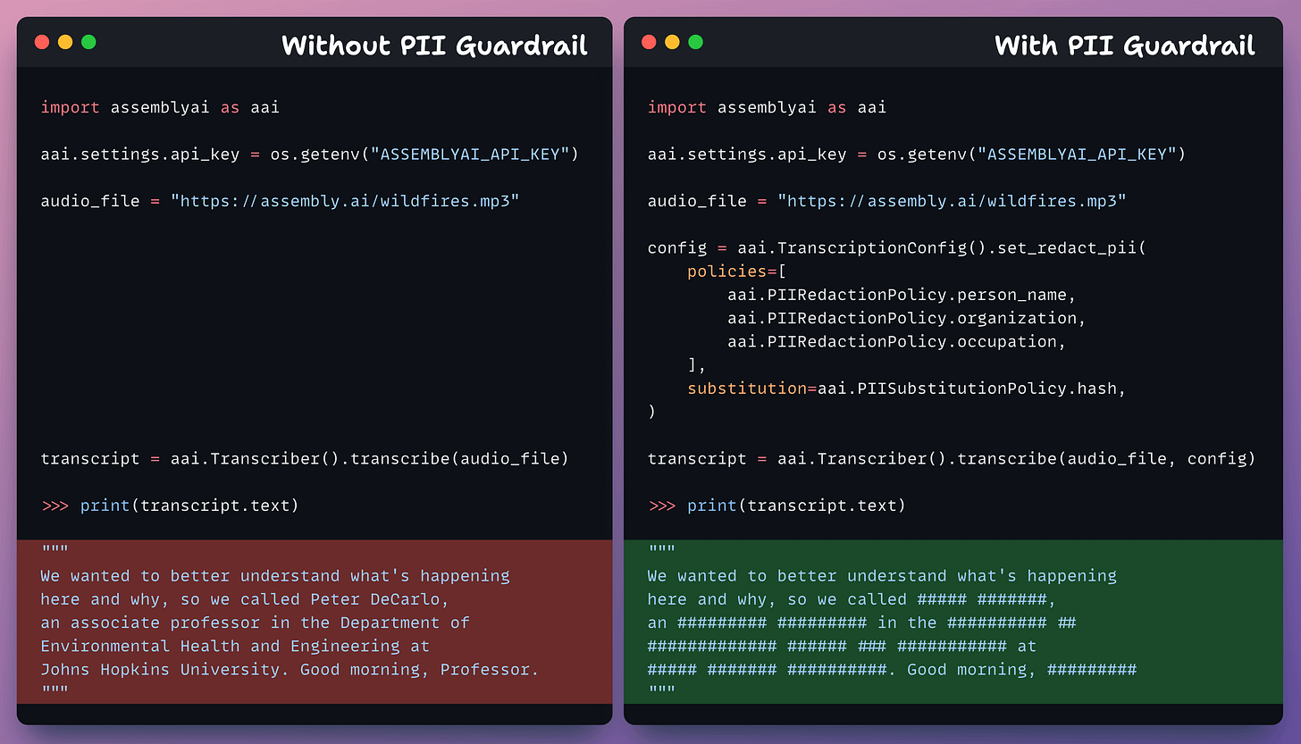 For instance, PII Redaction lets you automatically detect and remove personally identifiable info, like names, addresses, organizations, etc., from transcripts: