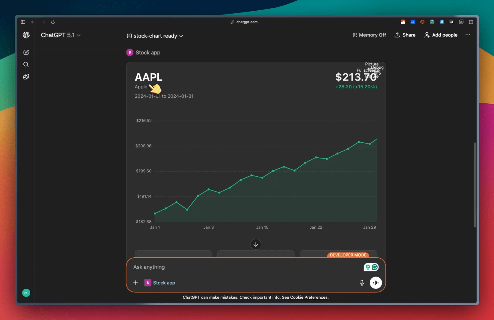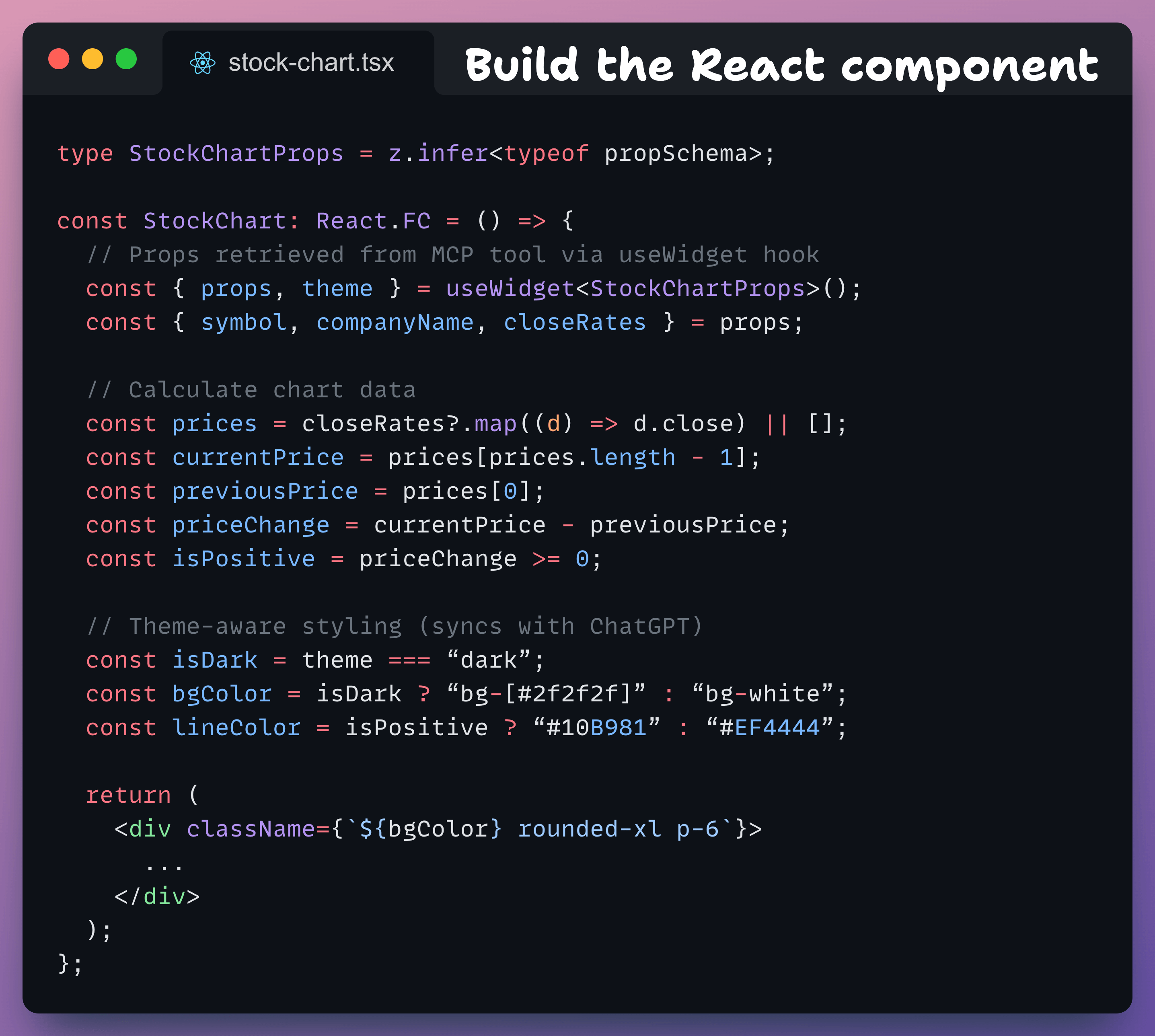 useWidget()retrieves props passed from the MCP tool call (no React props needed)themeautomatically syncs with ChatGPT’s light/dark modeRest is standard React, where you can build your UI however you want (Tailwind, styled-components, Material-UI, etc.)