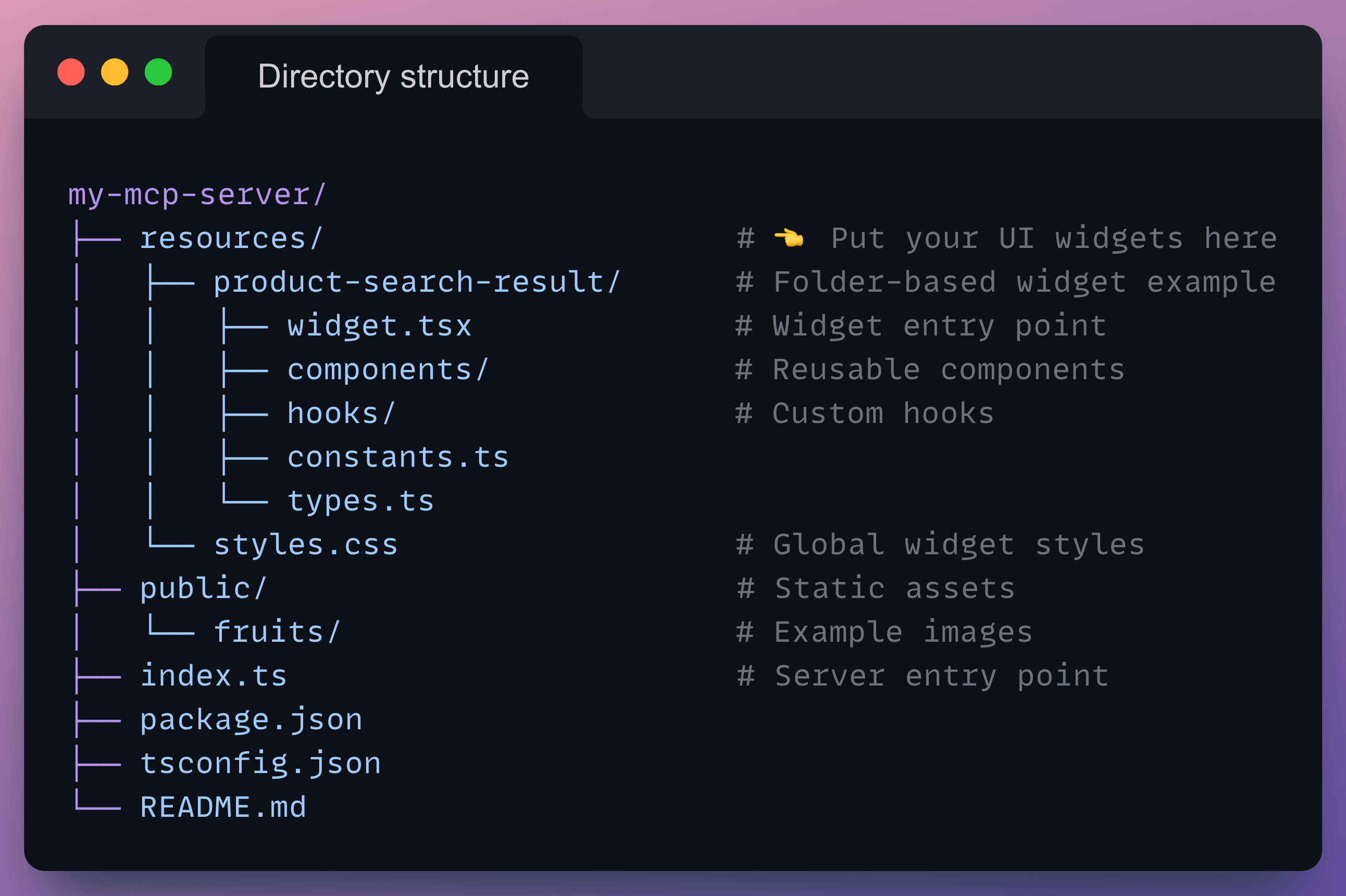 Each .tsx file in the resources/ folder becomes a widget that can be used by MCP clients to render tool output.