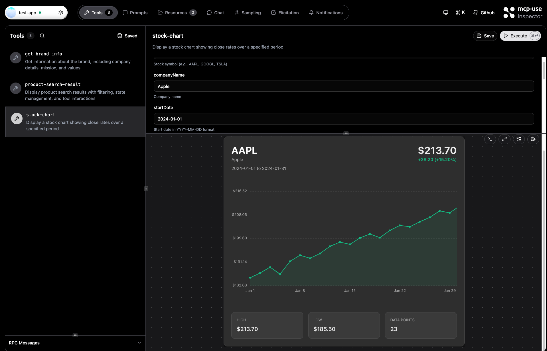 This will open the upgraded mcp-use inspector. Upon navigating to Tools, you will find stock-chart automatically registered, and you can test it with sample data:
