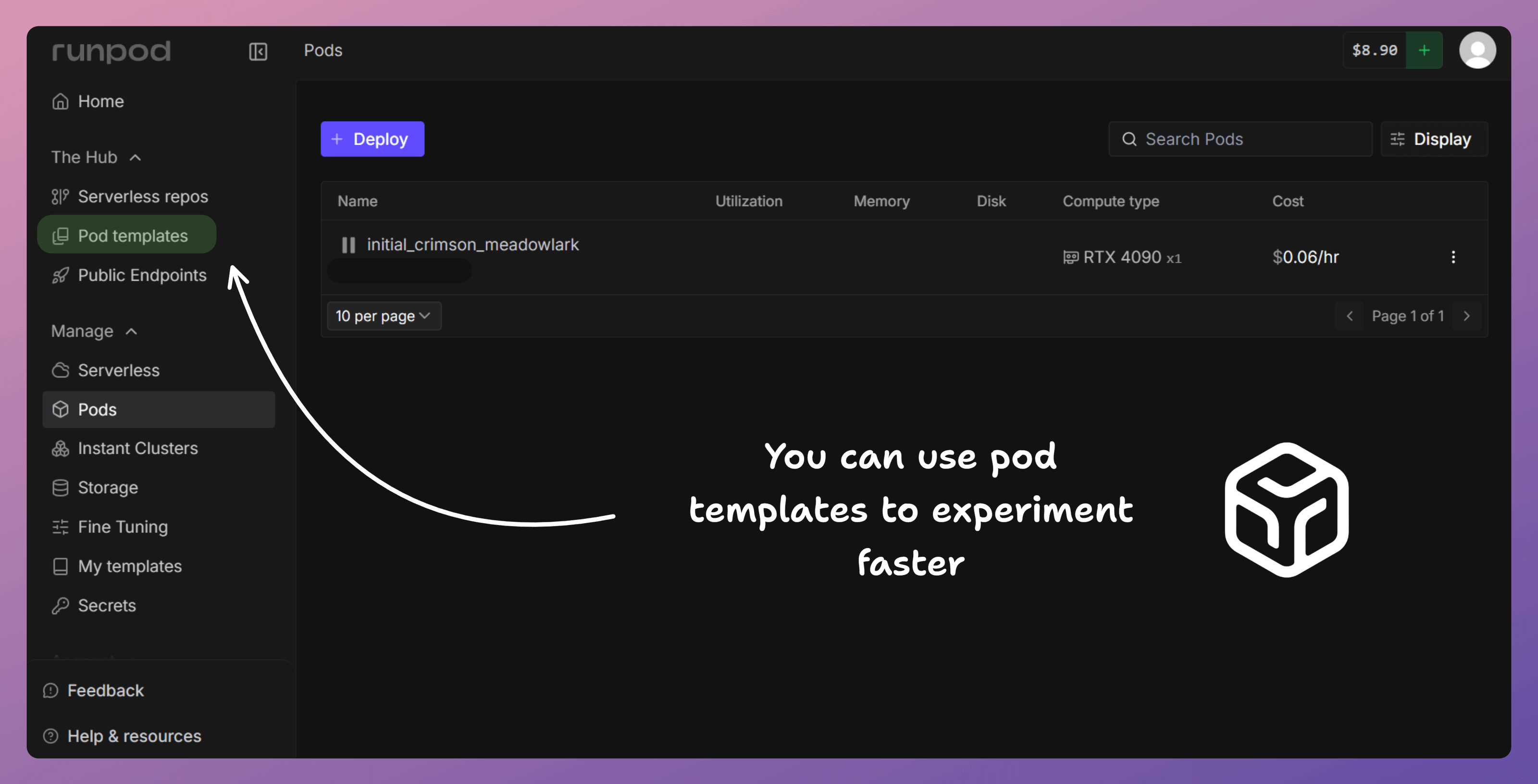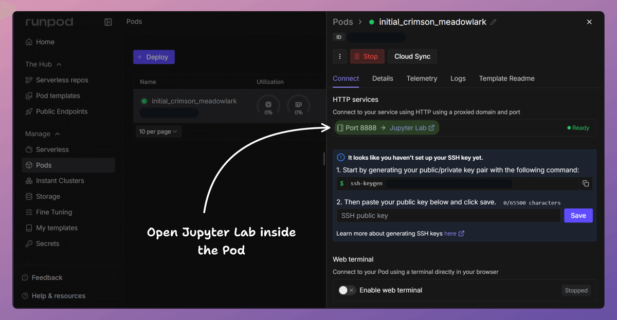 First, we spin up a Runpod Pod with a GPU (e.g., RTX 4090).