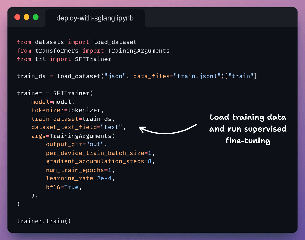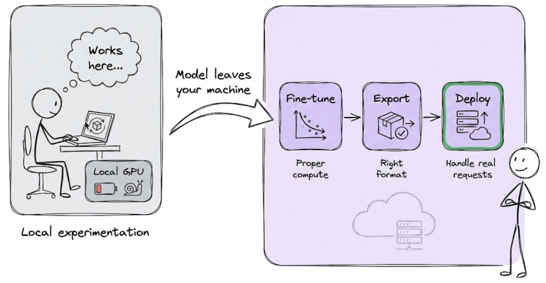 At some point, the model needs to leave your machine. It needs to be fine-tuned on proper compute, exported in the right format, and deployed behind an endpoint that can handle real requests.