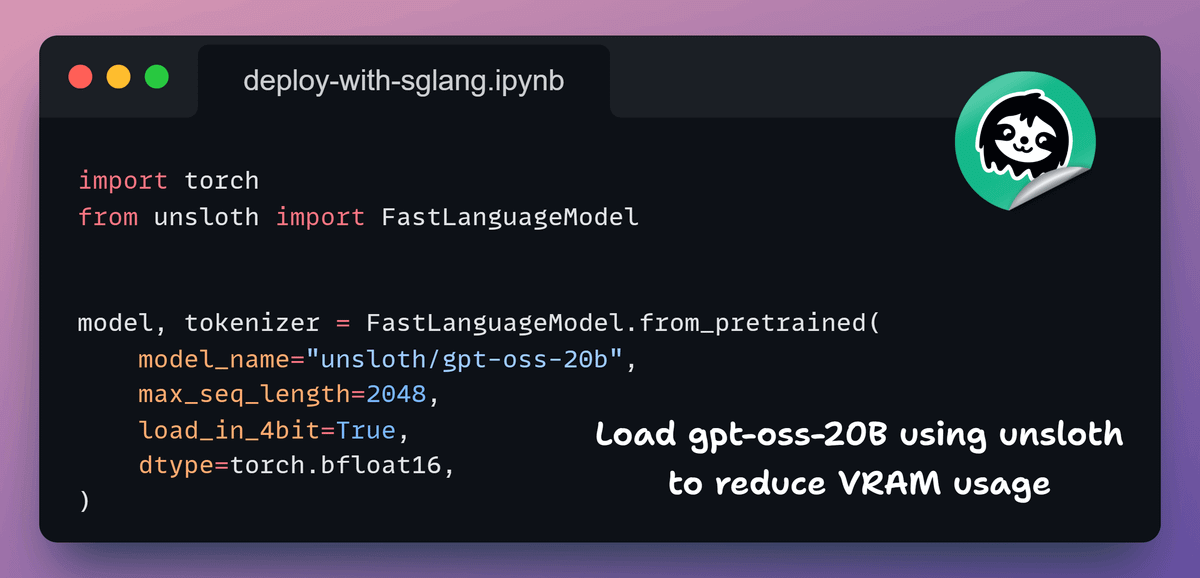 Unsloth’s training loop is optimized for large models, so training stays fast while using far less GPU memory.