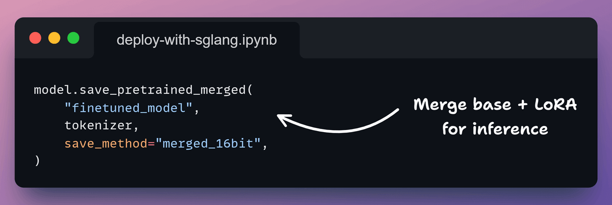 This combines the base model and LoRA adapters into a single artifact that inference engines can load directly.