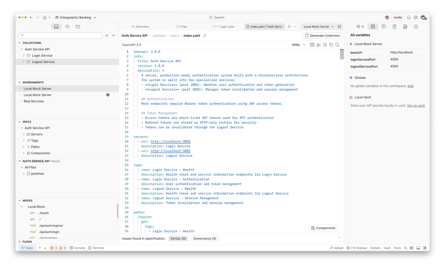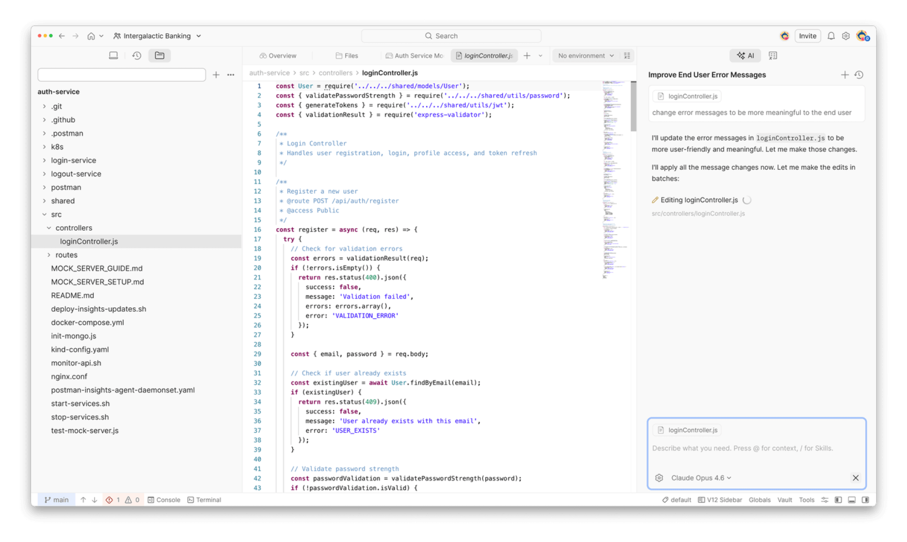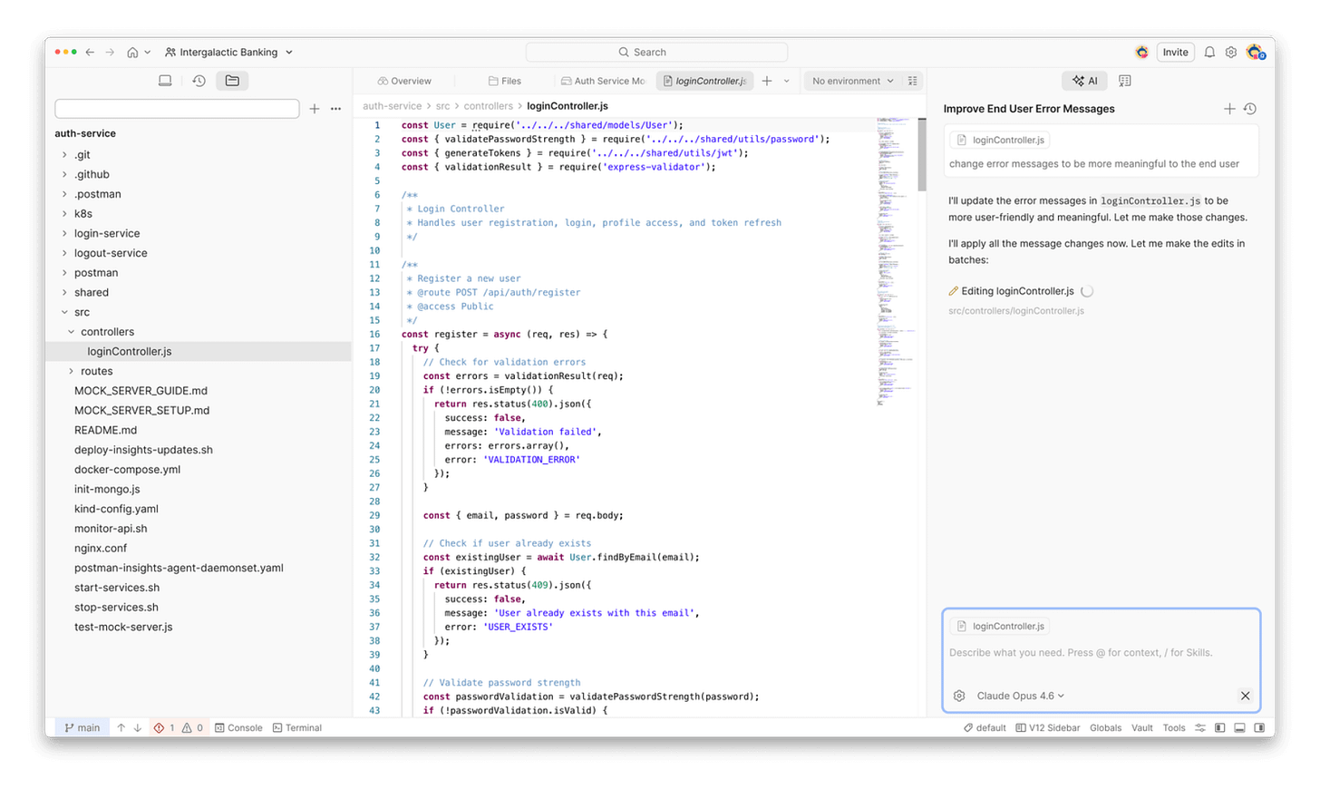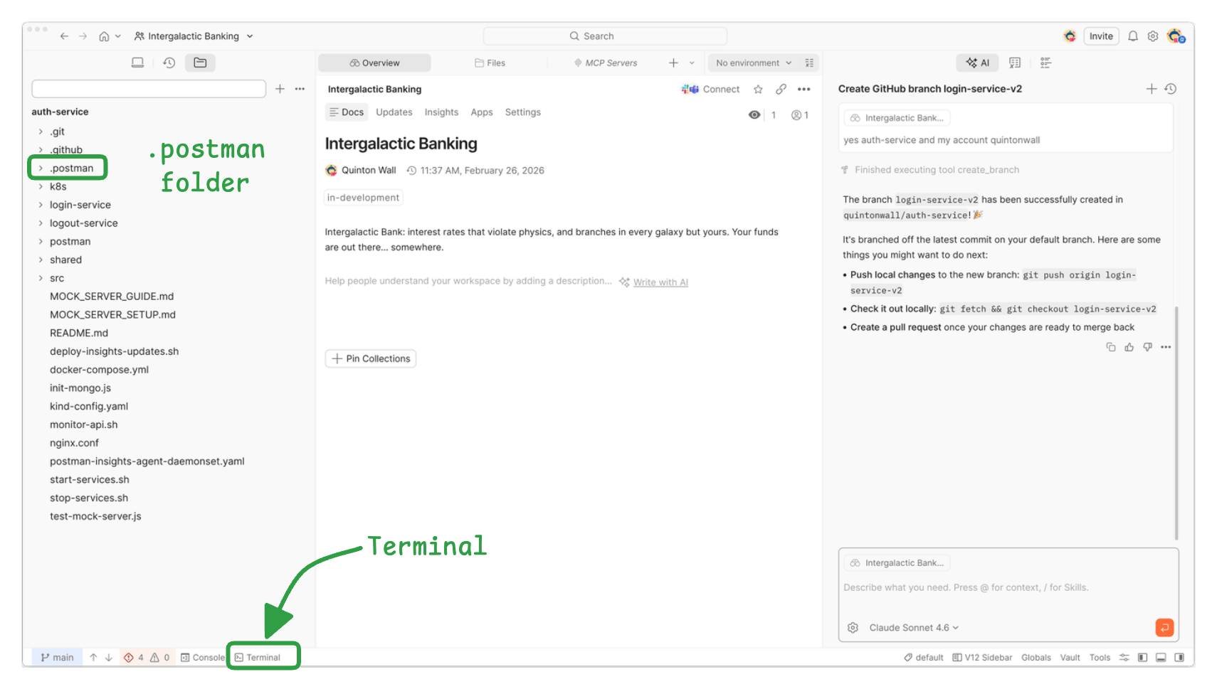New Postman also added a built-in terminal and file editor, so it’s possible to run Git commands, inspect code, and edit collections all within the same window. The workspace connects directly to a local Git repository, and switching branches in Git automatically reflects in the Postman UI.