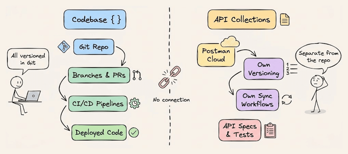 The codebase sits in Git, CI pipelines run on branches and pull requests, but API specs, collections, and tests have historically been managed in Postman’s cloud with their own versioning system and their own sync workflows.