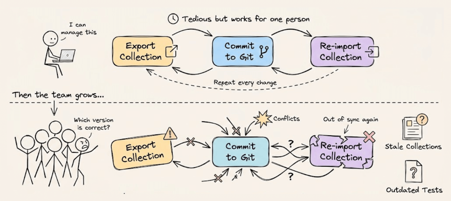 Keeping collections in sync with code changes meant manually exporting, committing, and re-importing, and that process breaks down pretty quickly as teams scale.
