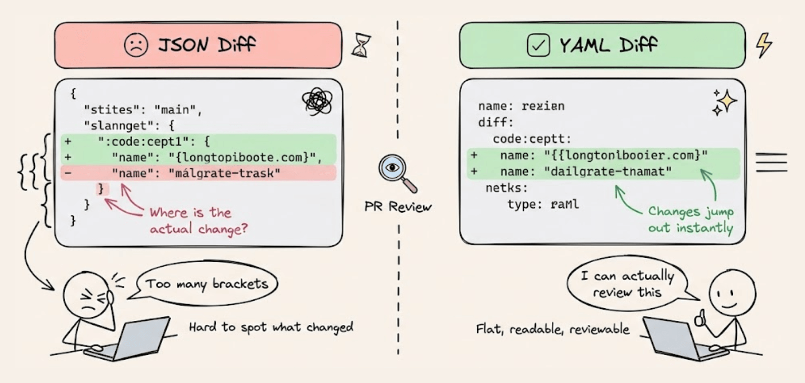 First, YAML produces much cleaner Git diffs. Reviewing a JSON diff in a pull request with deeply nested brackets and braces is genuinely hard to parse. YAML is flatter and more readable, so it becomes realistic to actually review collection changes in PRs the way we review code.