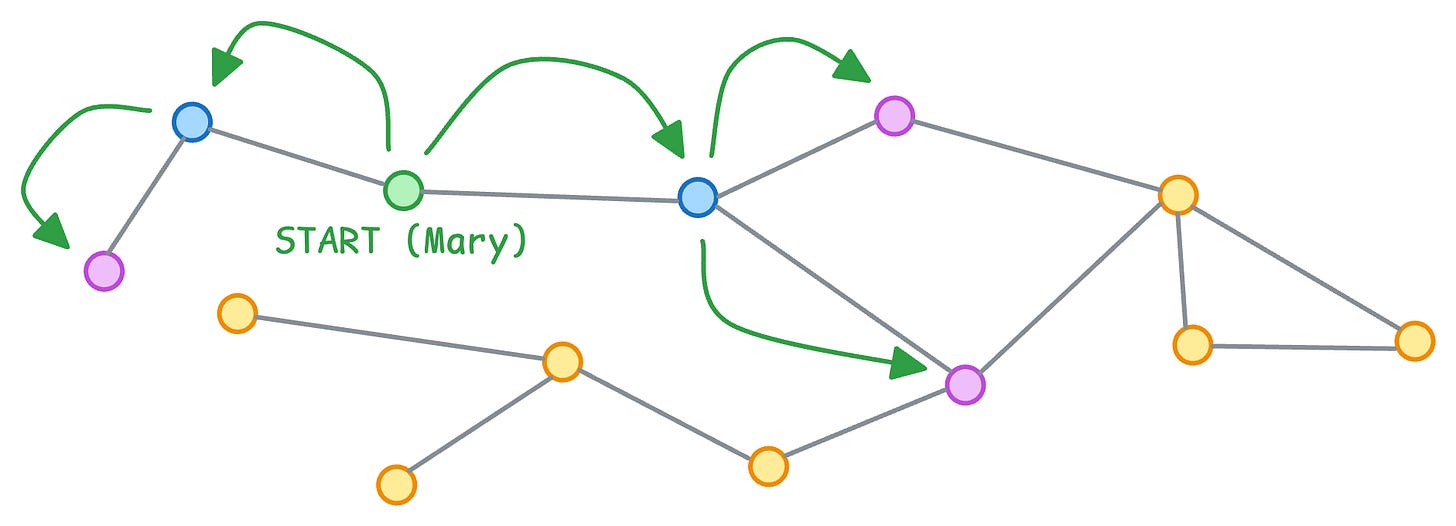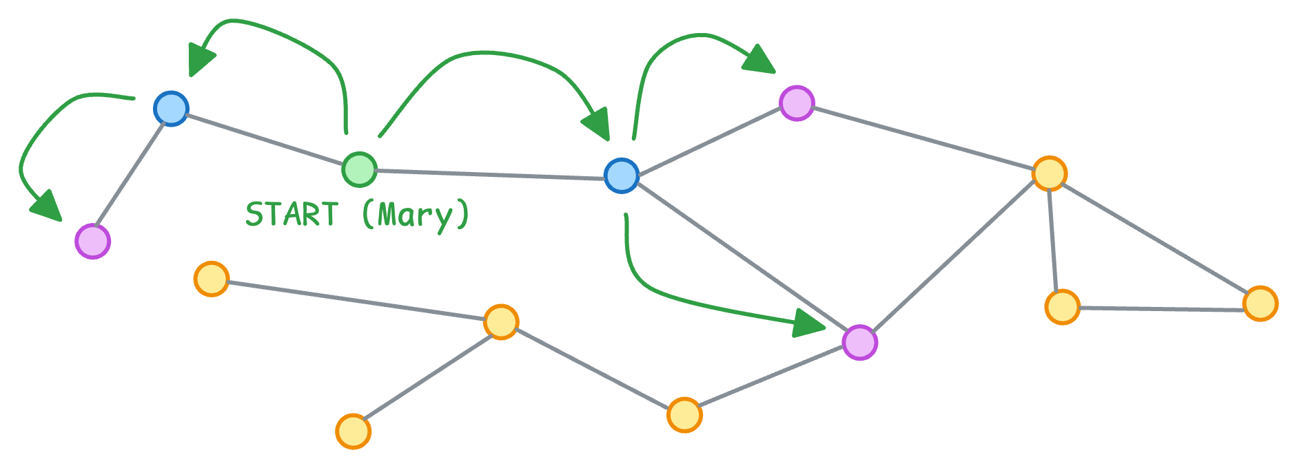 Finding who Mary’s friends follow? In a traditional graph DB, you hop twice: Mary (Green node) → friends (blue nodes) → friends’ friends (purple node).
