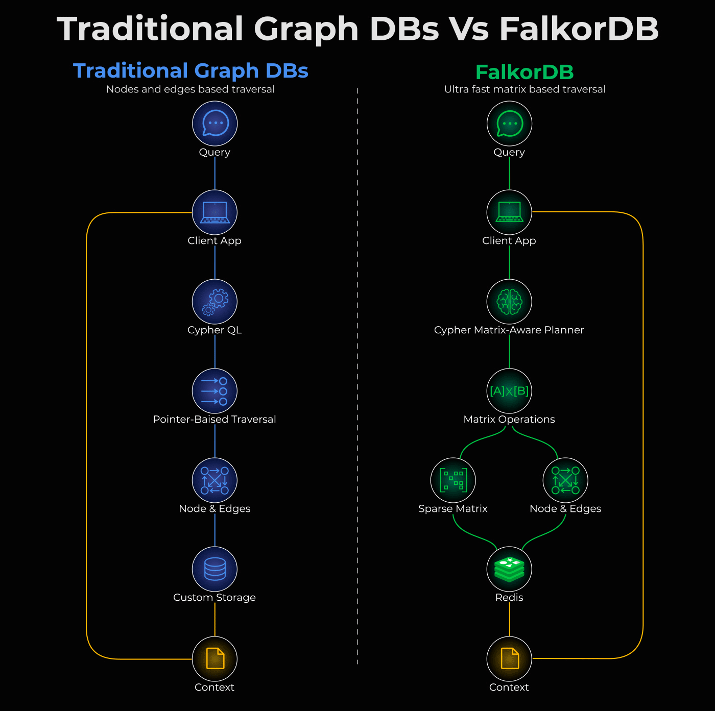 FalkorDB uses a Matrix-Aware Planner that converts queries into matrix operations.