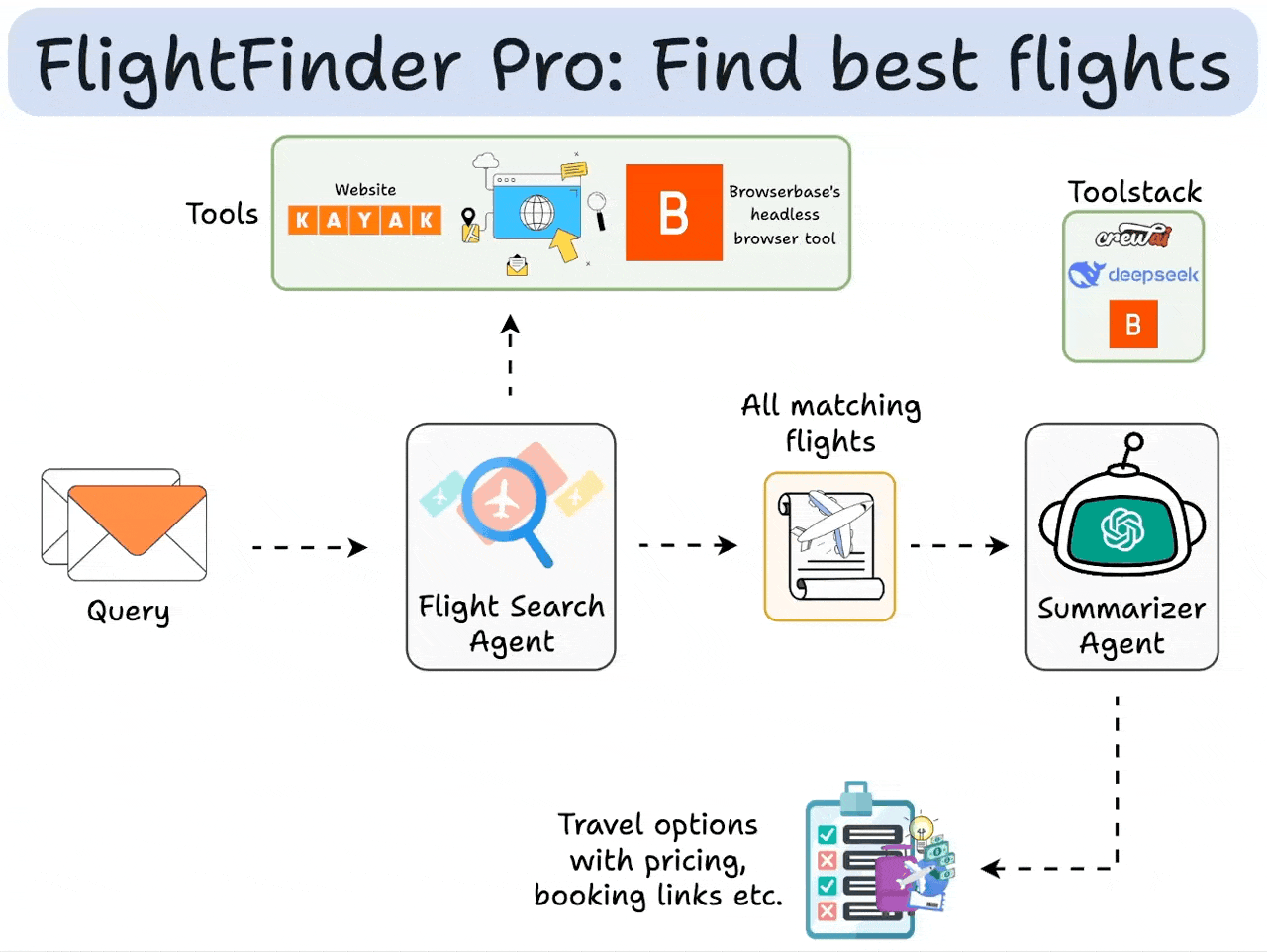 The flight search agent uses the Browserbase tool to simulate human browsing and gather flight data.