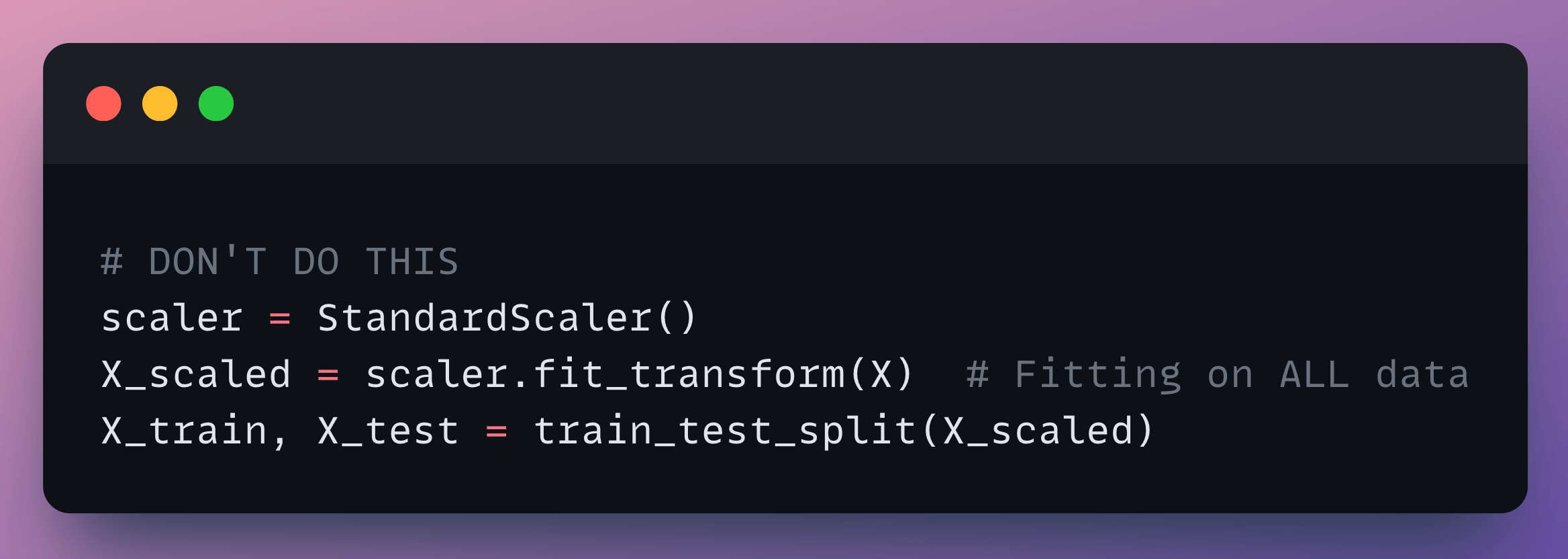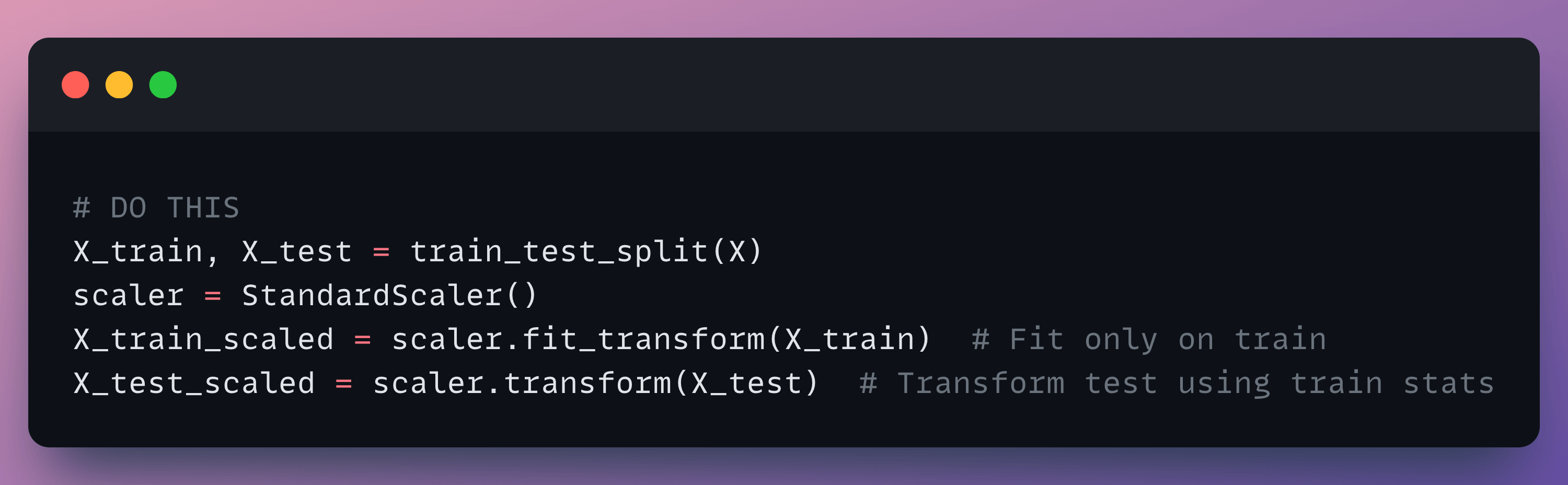 Why it’s wrong: The scaler learned statistics (mean, std) from the test data, leaking information.
