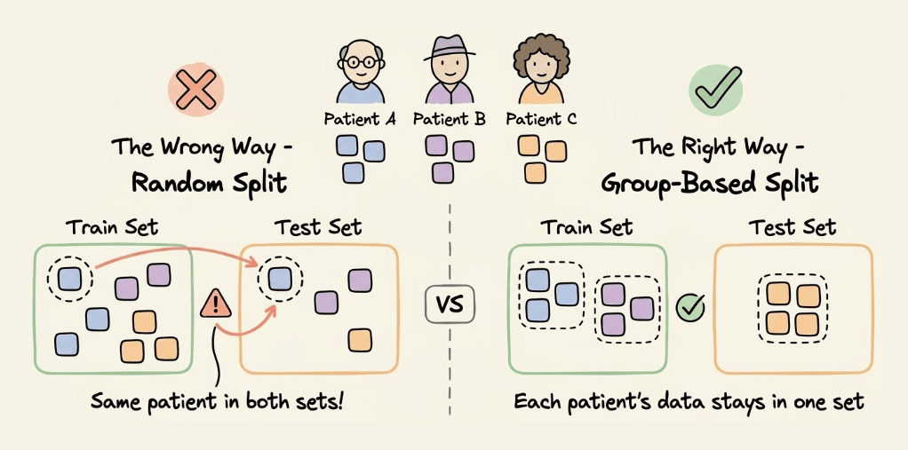 Why? If one patient’s data is in both the train and test, the model might just memorize patient-specific patterns rather than learning generalizable features.