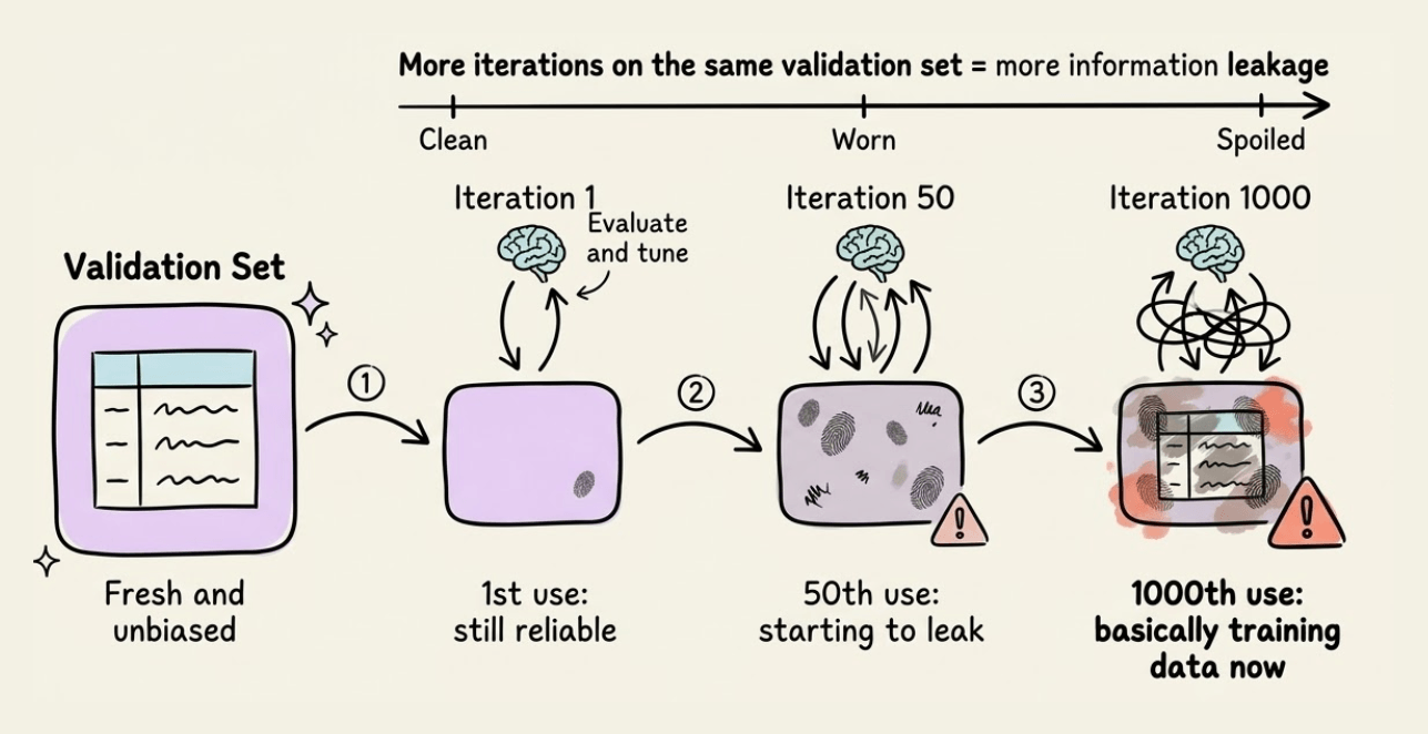 If you repeatedly tune your model based on validation performance over many iterations, you risk indirectly overfitting to the validation set.