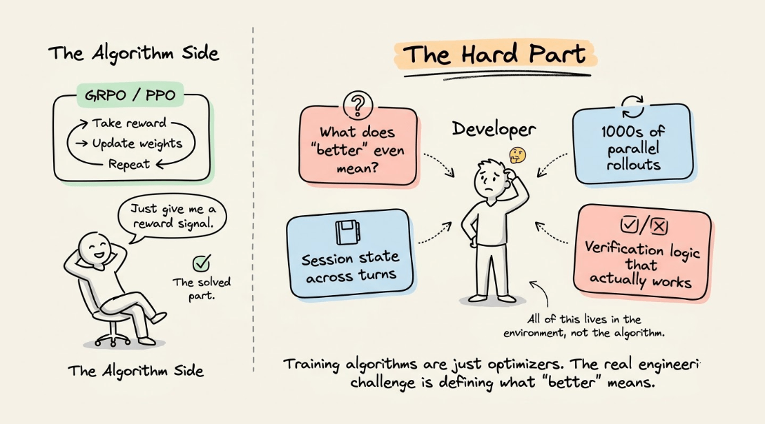 The hard part is everything that comes before that, like defining what "better" actually means for your agent, building the infrastructure to generate thousands of parallel rollouts, managing isolated session state across multi-turn interactions, and designing verification logic that reliably scores agent behavior.