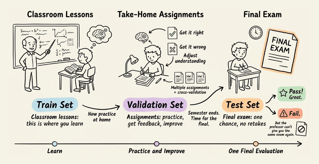 The professor gave you take-home assignments, which acted like validation sets.