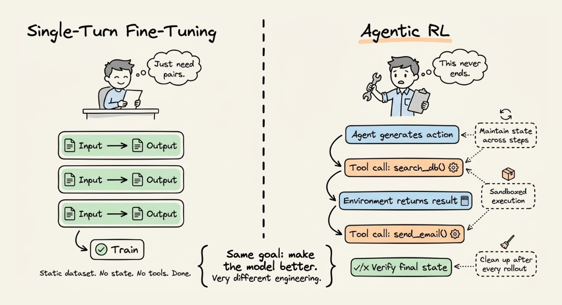 And unlike single-turn fine-tuning, where you just need input-output pairs, agentic RL requires your environment to handle tool calls, maintain state across steps, spin up sandboxed execution contexts, and clean up resources after every rollout.