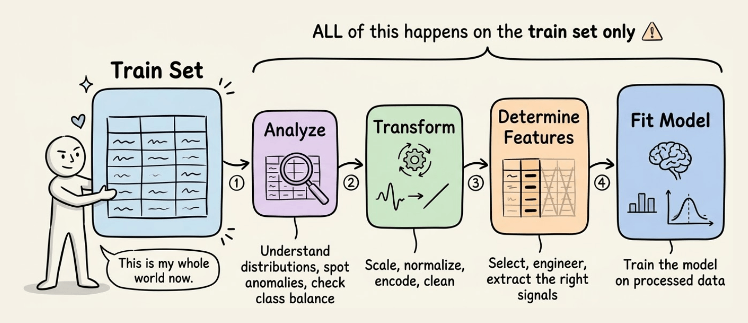 Begin with the train set. This is your whole world now.