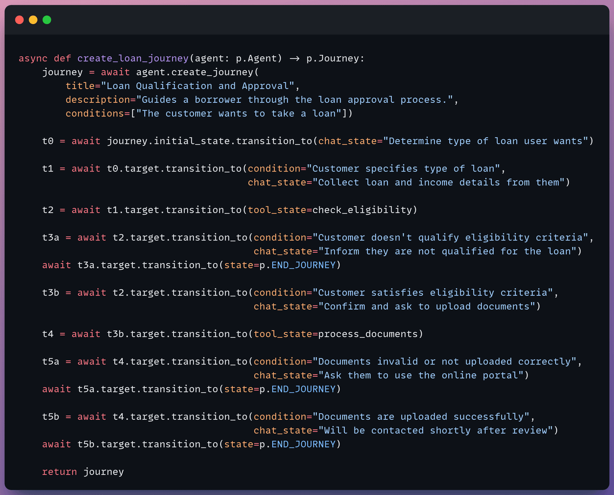 Parlant introduces the idea of Journeys. They inform the Agent about the multi-step conversational flow that helps it guide the user through the conversation as intended.