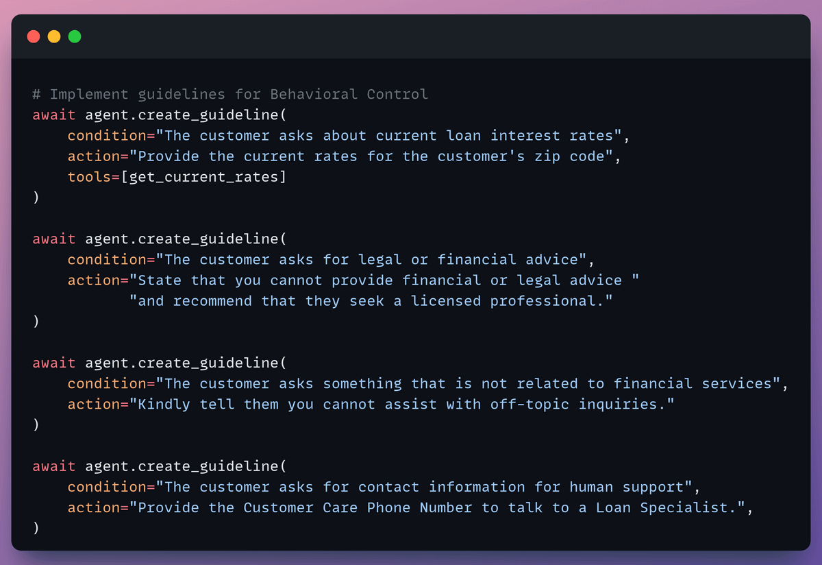 Guidelines in Parlant tell the agent how to approach specific situations through condition-action pairs.