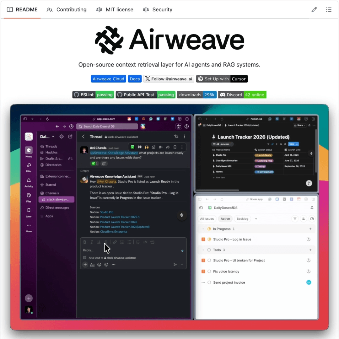 It searches every connected tool at once using Airweave (Notion, GitHub, Jira, Linear, etc.) to find relevant context.