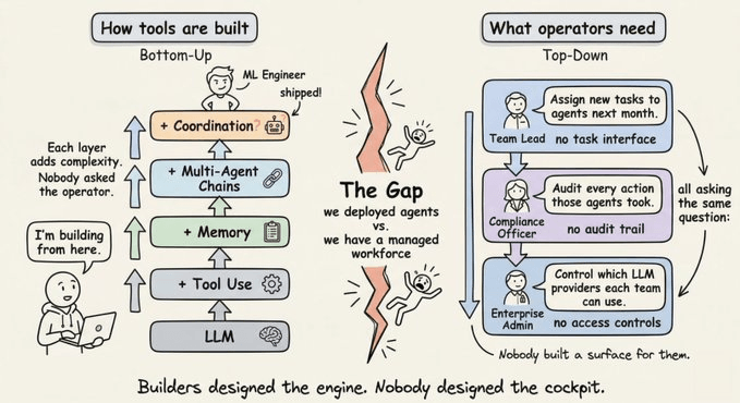 A developer building an agent workflow doesn’t think about the team lead who needs to assign new tasks to that agent next month. An ML engineer designing a multi-agent pipeline doesn’t think about the compliance officer who needs to audit every action those agents took. A product manager deploying an AI research assistant doesn’t think about the enterprise admin who needs to control which LLM providers each department can use.