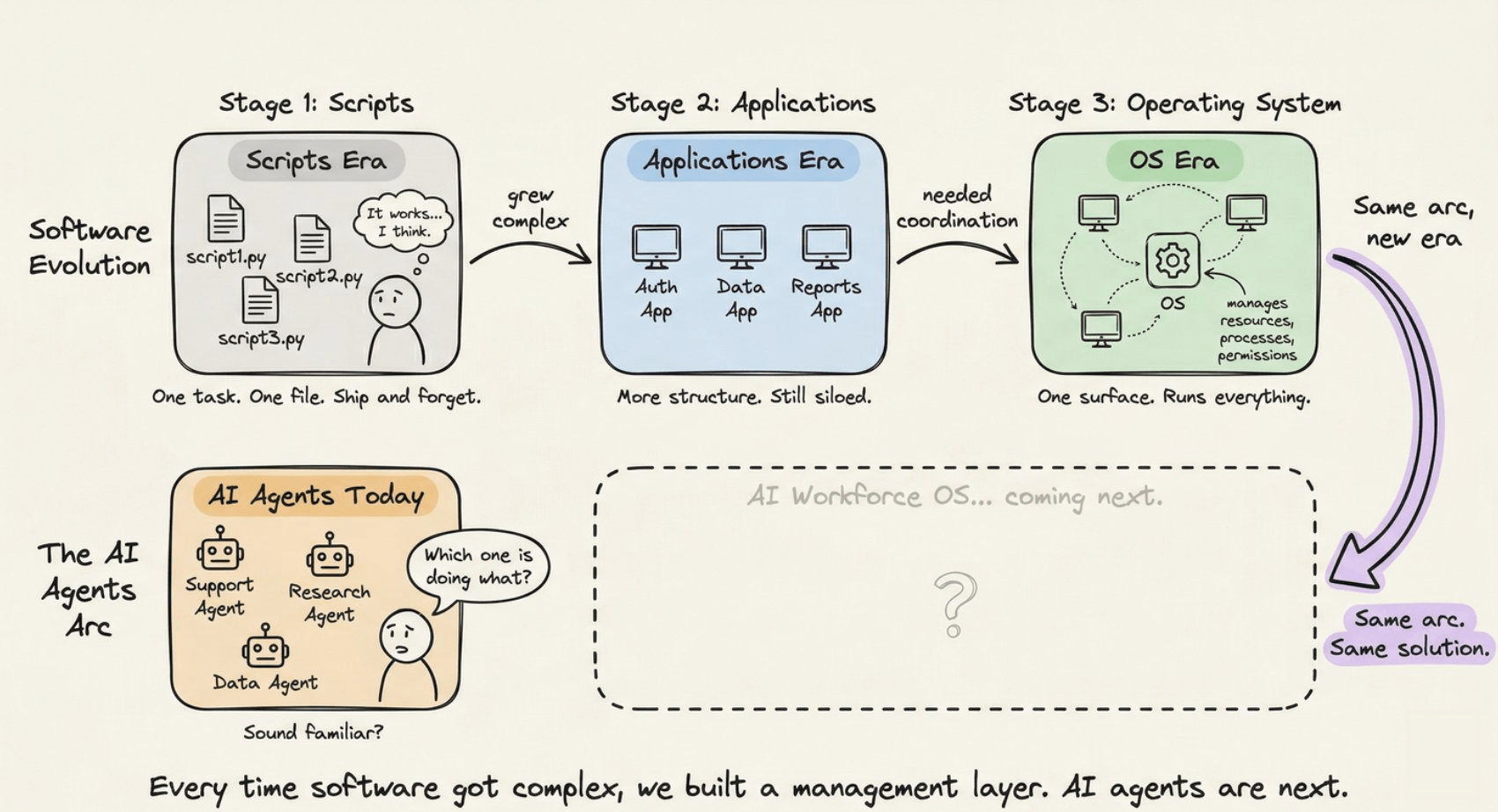 In the early days, developers wrote scripts. Then they wrote applications. Then systems got complex enough that you needed something to manage all those applications: an operating system. Something that handled resources, coordinated processes, and gave you a unified surface to interact with everything at once.