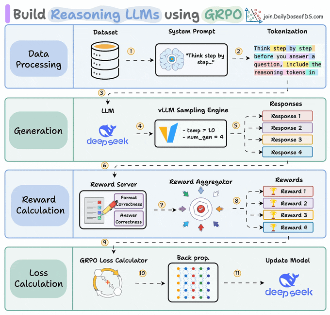 Essentially, instead of training a separate model to score responses, GRPO generates multiple completions and grades them relative to each other.