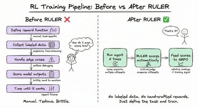 RULER (Relative Universal LLM-Elicited Rewards) eliminates this bottleneck entirely. It uses an LLM-as-judge to compare multiple agent trajectories and rank them, with no labeled data required.