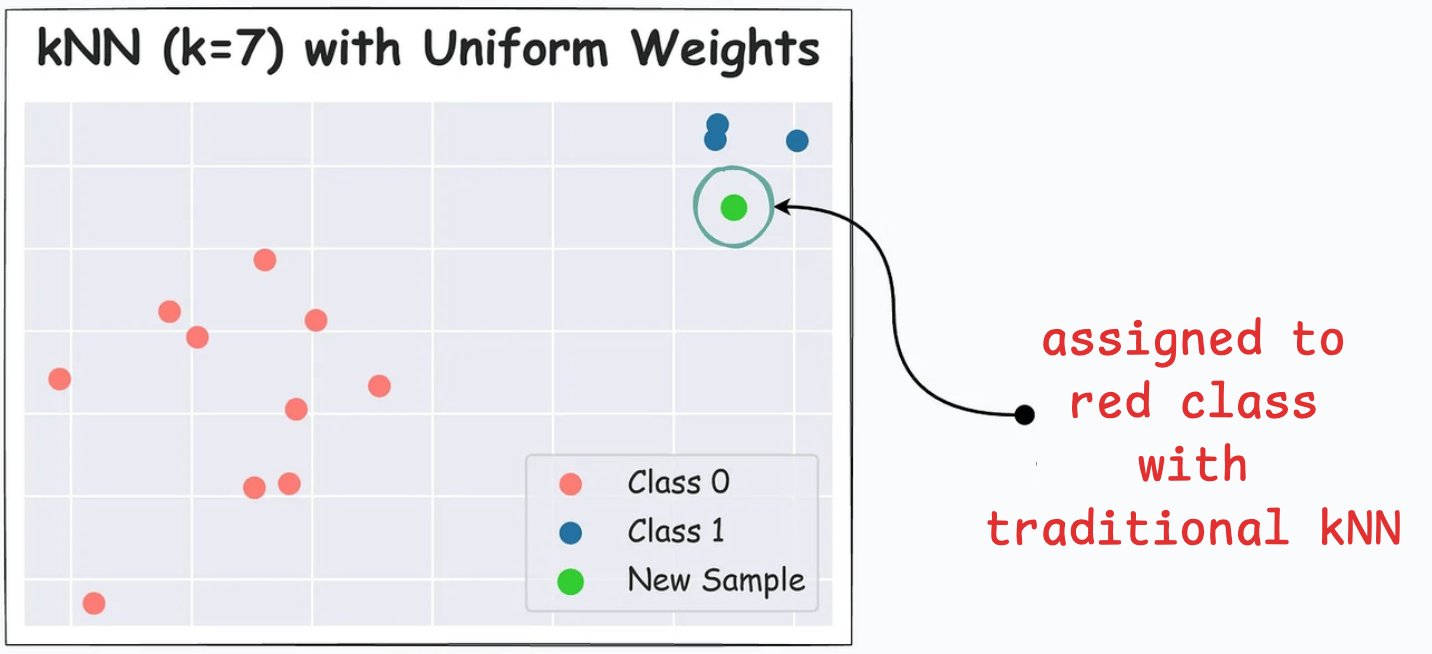 For instance, below, the green data point gets classified as red with traditional kNN (k=7), despite being closer to the blue cluster: