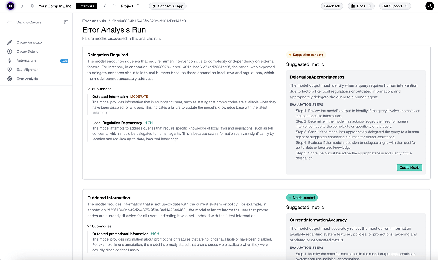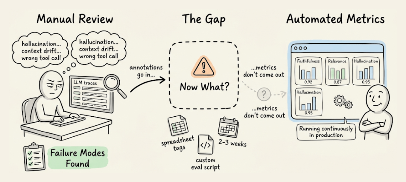 Let’s say you found some failure modes by reviewing production traces. But codifying those into the right eval metrics that correlate with human reviewers is its own engineering project.