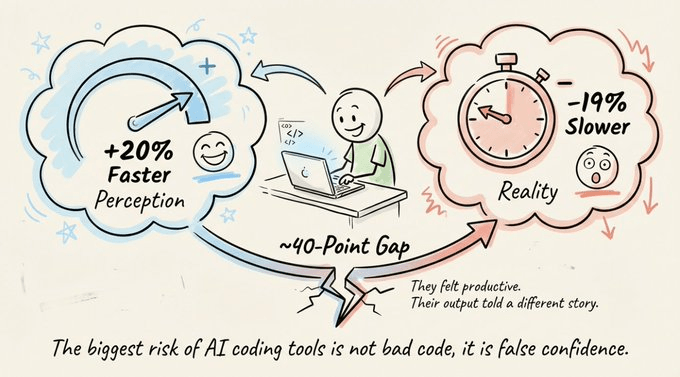 A randomized controlled trial found that experienced developers were 19% slower with AI coding tools. But those same developers believed they were 20% faster. That’s a nearly 40-point gap between how productive they felt and how productive they actually were.